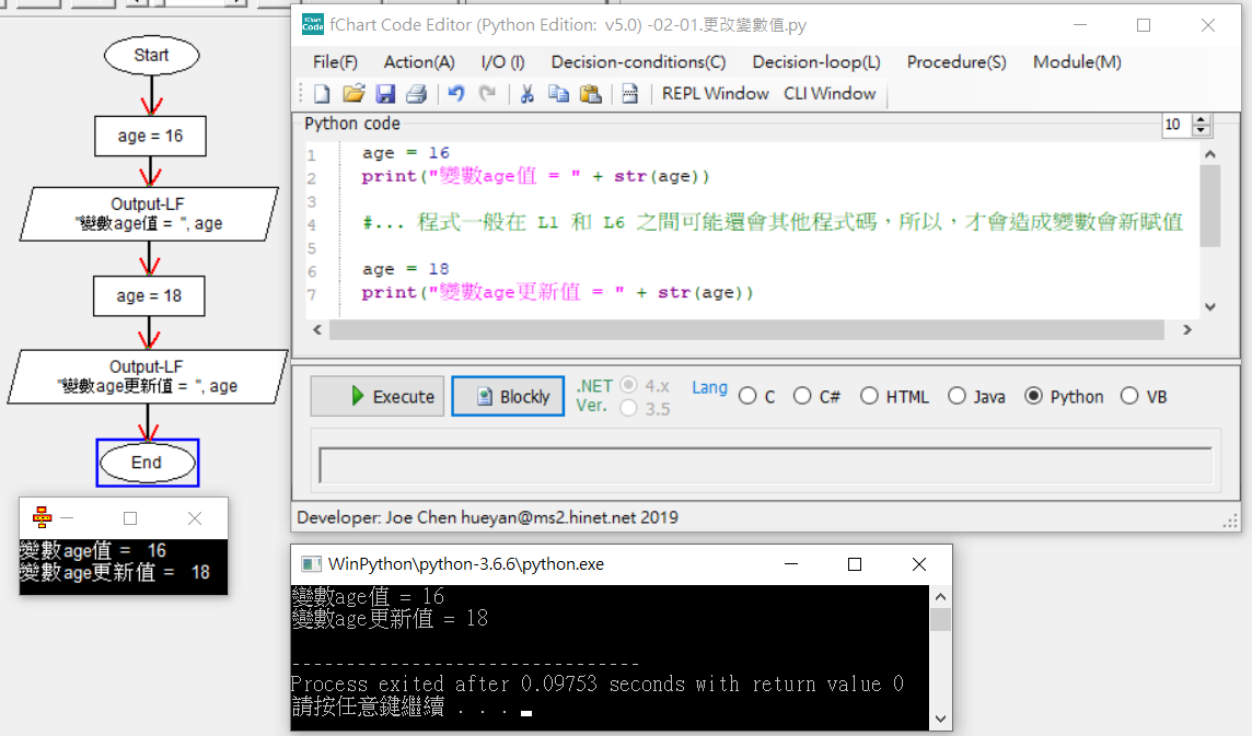 1. 02-01.更改變數值:因為我們在上一篇「以 fChart 馭 Python:變數與輸出輸入(2/11)」(https://reurl.cc/12bZyG)中已詳細示範如何在 fChartCodeEditor 的指令選單中選取適當的指令來